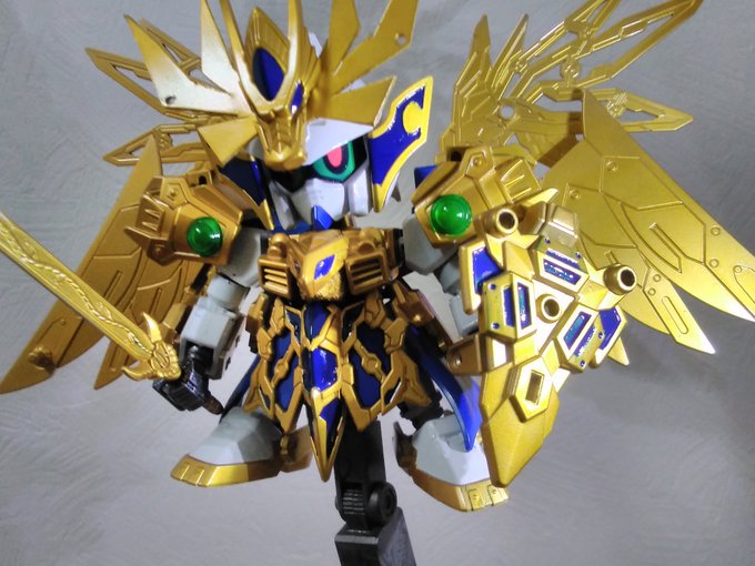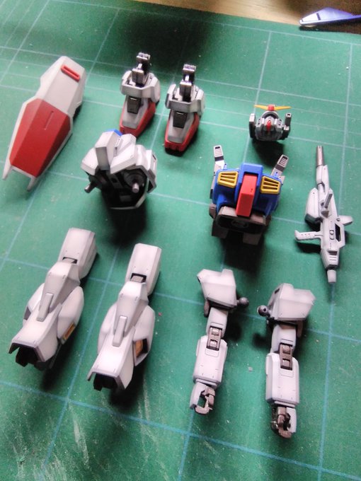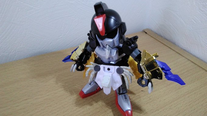 闇大帝製作記 2回目 1枚目の写真右から創傑伝の曹操から足を流用 闇大帝バックパックは武威凰のバックパックをふたつに切ってそのまま使用 頭と腰は昨日のパテ盛りを削って整形 大光帝使う肩だけサイズダウンのため削った 今日はこんな感じかなあ #闇大帝は発売されません #SDガンダム #ガンプラ