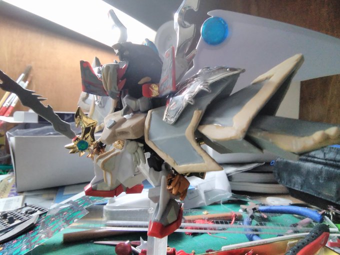 闇大帝製作記 1回目 真悪参をベースに改造初め、腰横は創傑伝の曹操、腰前は、大光帝をカットしそのまま使用、パテでいくつかパーツを作ったり盛ったりで今日は終了かな #闇大帝は発売されません #SDガンダム #ガンプラ好きと繋がりたい