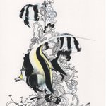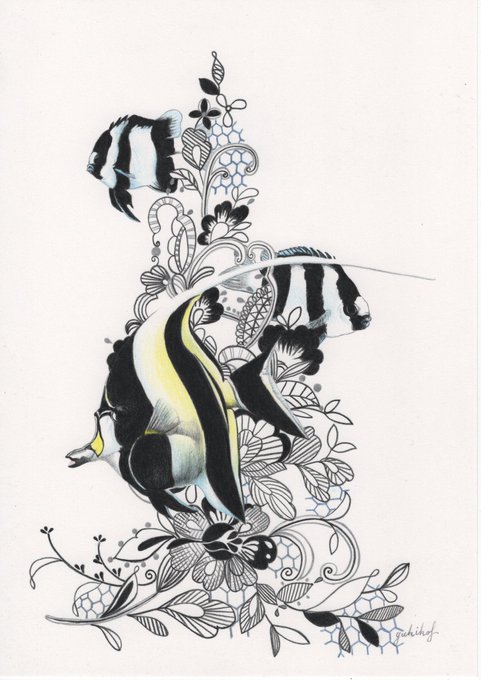 輪舞曲 ツノダシとミスジリュウキュウスズメダイ 目立たないようにこの姿と模様なのだろうけど、水中で見る私の目には圧倒的な存在感があるのだけど… #色鉛筆画 #絵描きさんと繋がりたい #イラスト好きさんと繋がりたい