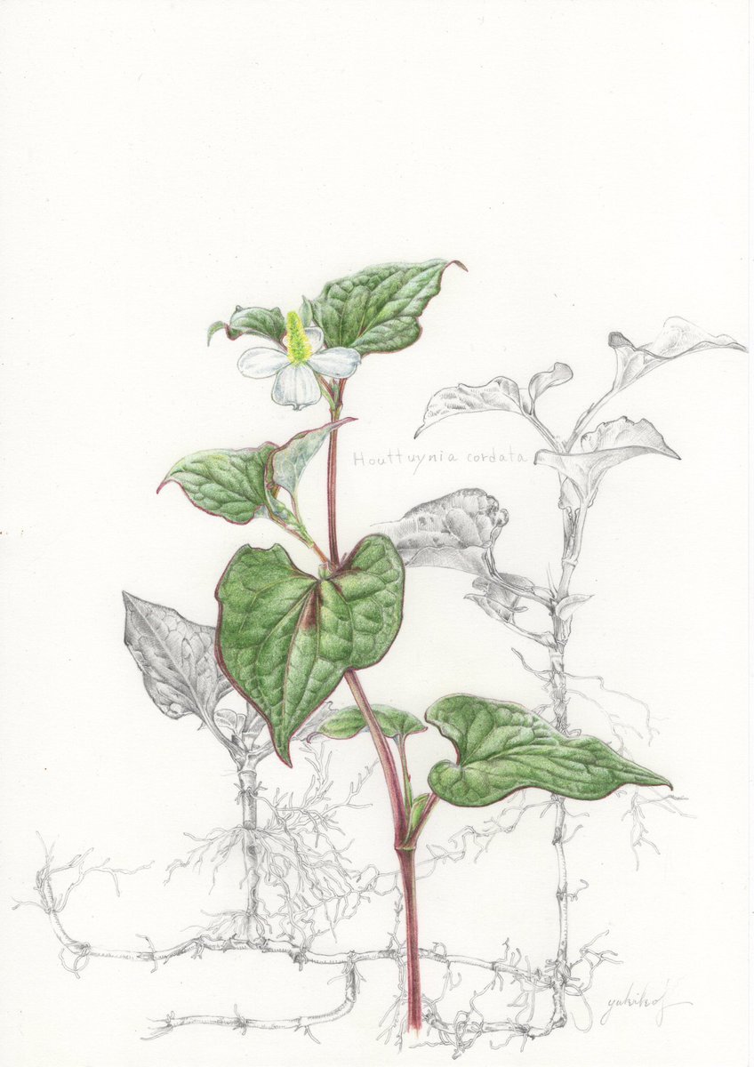 ドクダミ ドクダミ科 Houttuynia cordata 咲くとかわいいのですけどね〜 #植物画 #ボタニカルアート #色鉛筆画 #絵描きさんと繋がりたい #イラスト好きさんとつながりたい