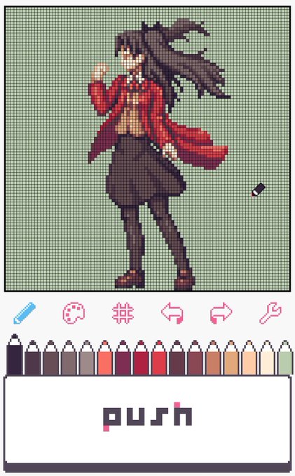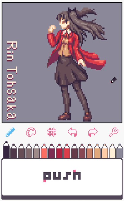 1 3 #ドット絵 FateUBW遠坂凛 取り敢えず完成です。これ以上打っても余り変わらないかな?と。自分の技量不足ですね。下書きの頃に考えていたことは出来てる…はず。 20/06/16 22:12