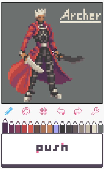 0 1 #ドット絵 FateUBWアーチャー 完成。前回の凛よりサイズの小さい64×64で作りましたが意外とやりやすかったです。細かい表現が出来ない分、特徴的な部分を強調するよう心掛けました。いい感じに仕上がりました。 20/06/22 11:27