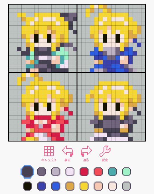 0 3 #ドット絵 アルトリア顔のセイバー達です。16×16ドットに16色(1色は透明色)で4体作ってみました。誰だか分かります? #FGO #アルトリア顔 #pixelart 22/07/11 17:21