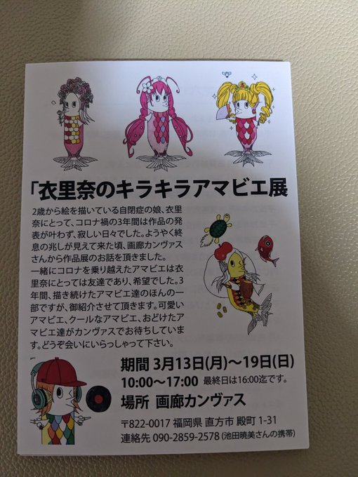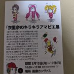 娘の衣里奈のイラストと絵画の作品展が3月13日より始まります。チラシとポストカードも出来上がりました。小さな作品展ですが、皆様に楽しんで頂けるものにしたいと準備に努めております。なかなか皆様のTweetにいいねやコメントが出来ないかも知れませんが、お許し下さい🍀 #絵描きさんと繋がりたい