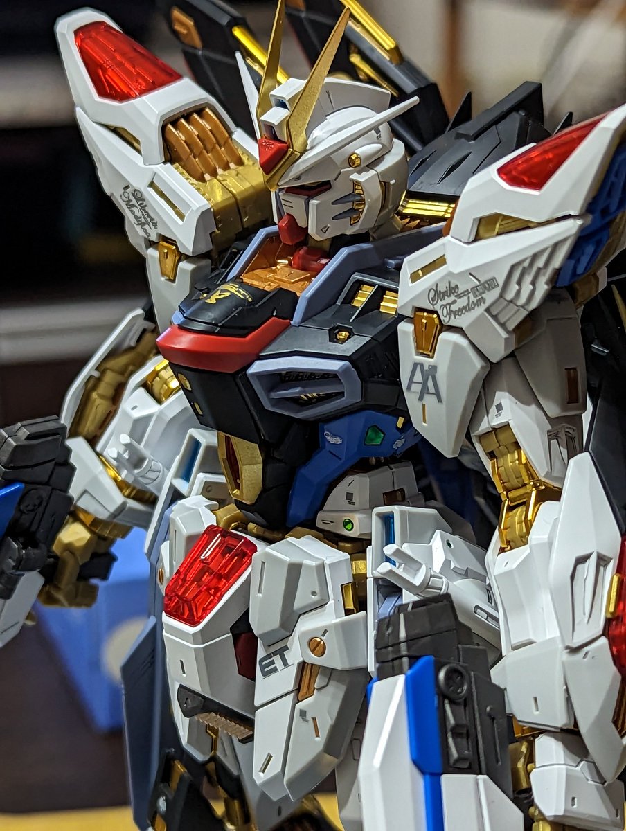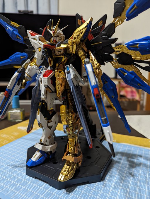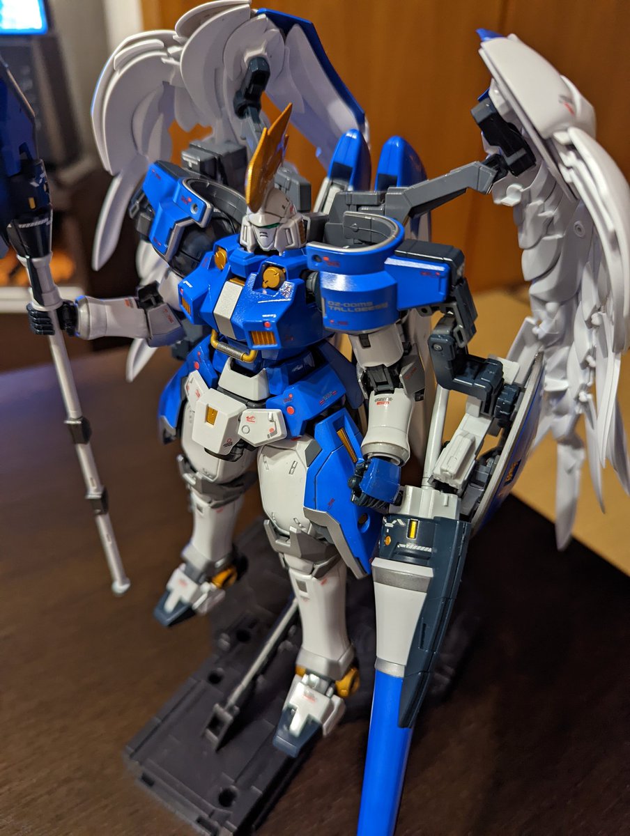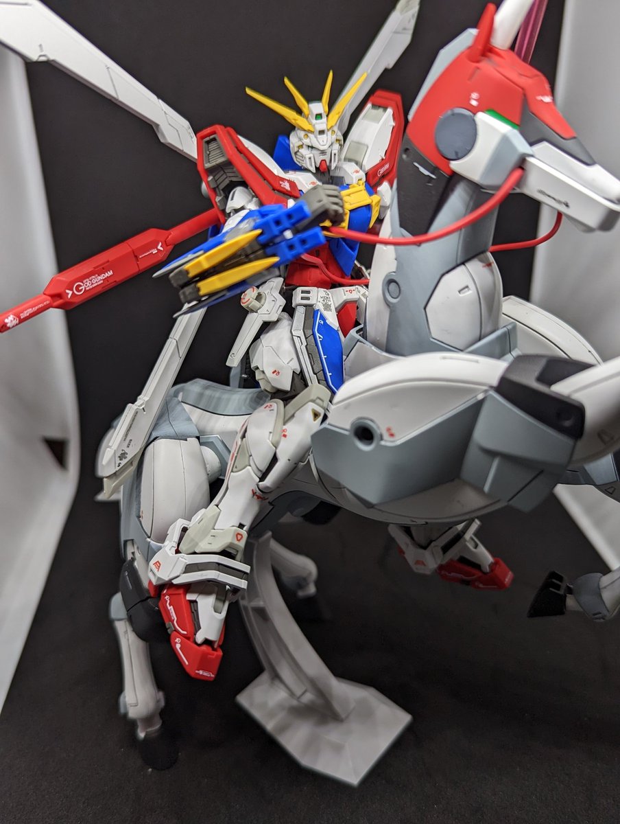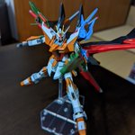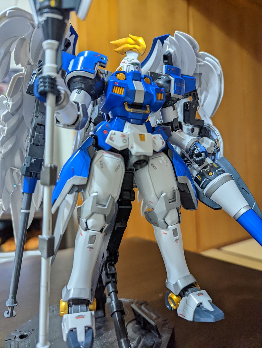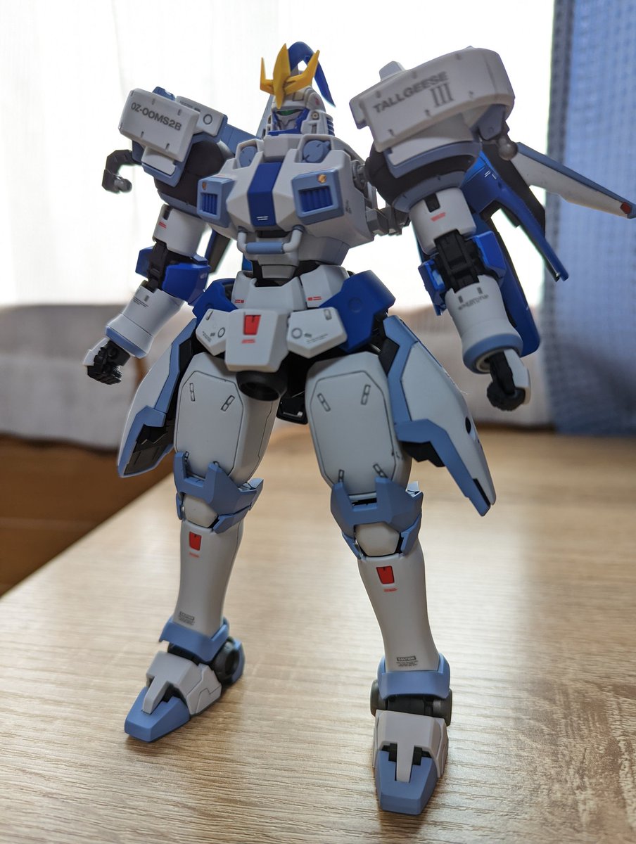 #ガンプラ #ガンプラはどんな自由な発想で作ってもいいんだ MGトールギスF完成しました🎉 槍【騎士】+羽【優雅】=エレガント✨=【閣下】🤩 という事でこの配色に✨ さほど違和感ないと思いますが、いかがでしょう。 しかしやはり背負いモノ重い💦
