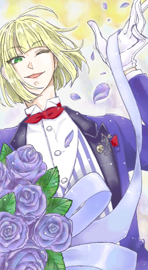 #ツイステ1周年 #ツイステ #twstファンアート かなり遅めのツイステ1周年お祝いイラスト!改めておめでとう〜!!!!👏🎉 友と絵チャでそれぞれの推しを描きました!🏹先輩描いたよ 🌹まむ @Amamuro09 🐙 ◢℃@21467_7