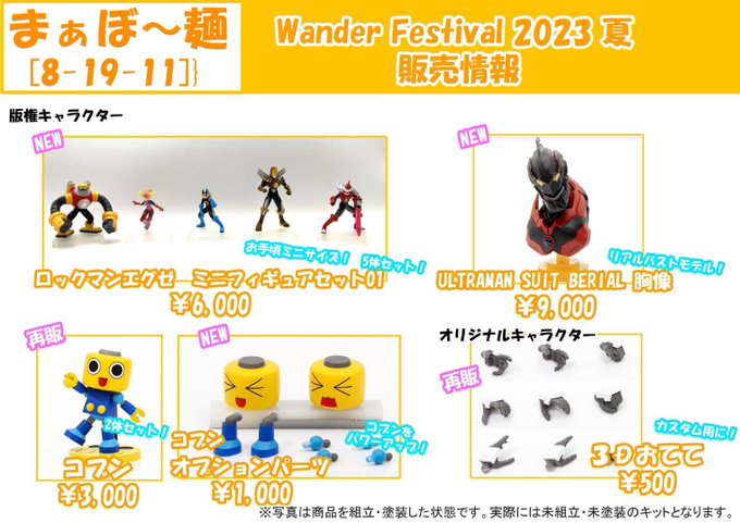【告知】今週末のワンフェスのまぁぼ〜麺のお品書です。みんな遊びに来てね! 卓番:8-19-11 まぁぼ〜麺 ・ロックマンエグゼ ミニフィギュアセット01 ・ULTRAMAN SUIT BERIAL 胸像 ・コブン2体セット ・コブンオプションパーツセット ・3Dおてて #WF2023S #WF2023Sおしながき