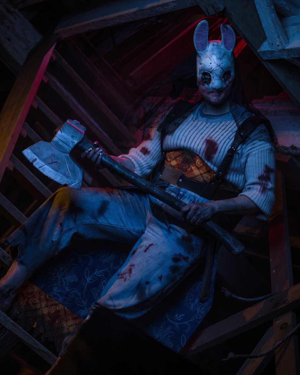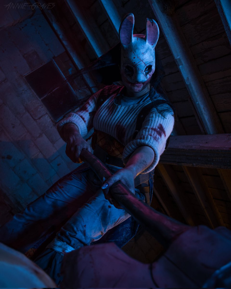 A figure clad in the head of a hare. A most disturbing sight. @DeadByBHVR @Behaviour - Huntress: Me 📷: instagram.com/anniegraves.ph… Lighting: instagram.com/mortimush/ - #DeadbyDaylight #dbd #cosplay #deadbydaylightcosplay #Huntress #horror #videogames