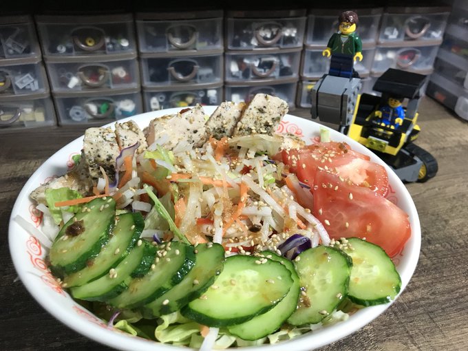 おはようございます(´∀`*) 朝から野菜増し増し増ーし増しサラダを頂いて元気つけてこうと思いまっす‼️ 僕の好きな野菜達よ❗️これ以上、高騰しないでおくれ😭 けど、農家さんが潤う分には構わないんだけどね♫ #LEGO #レゴ #オモ煮会 #オモ写