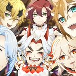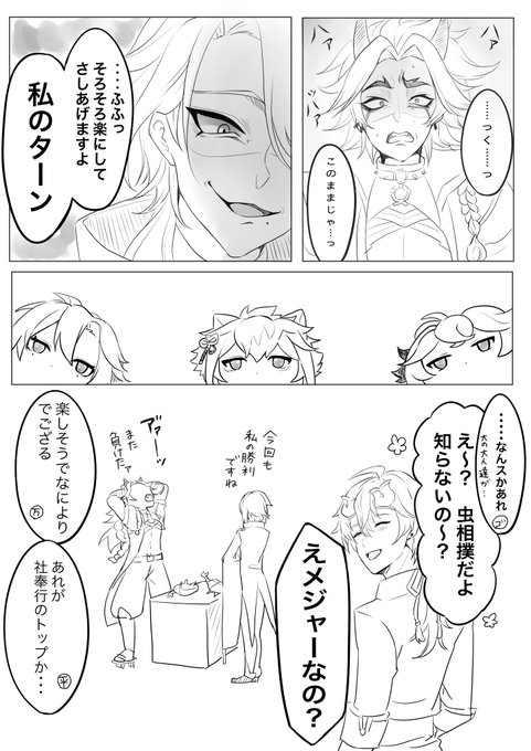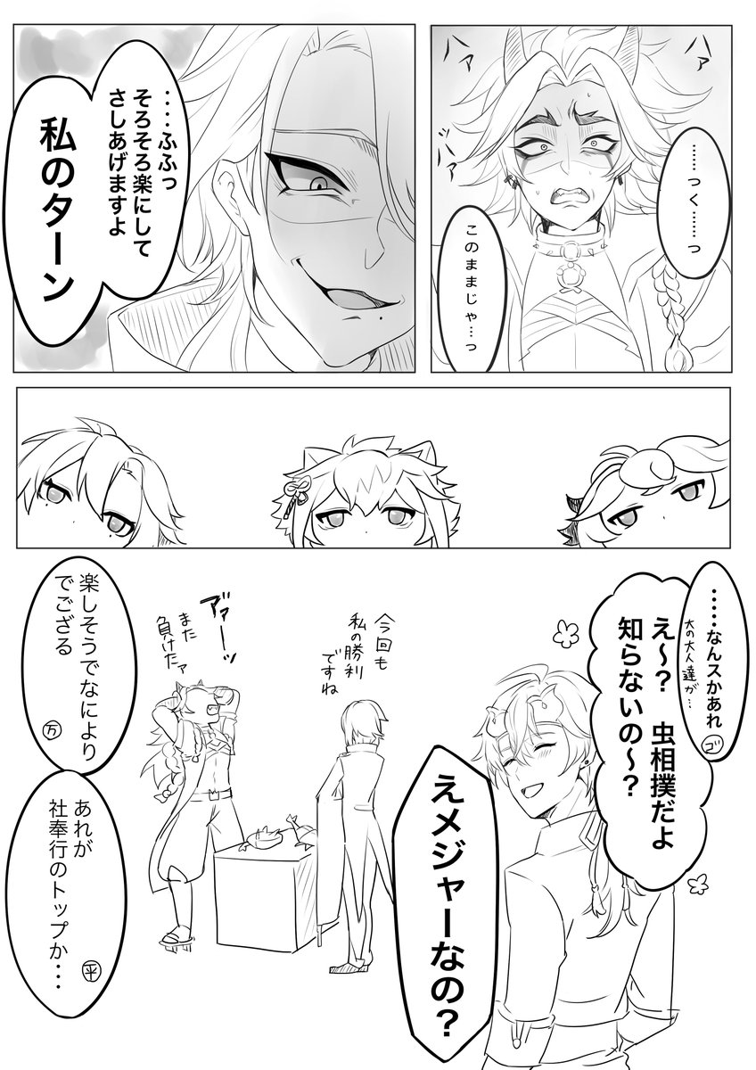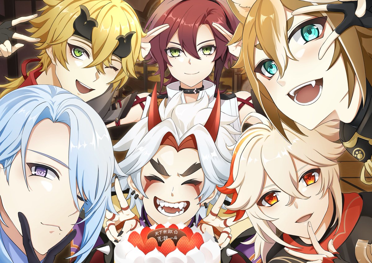 新年一発目イラストˊᵕˋ 稲妻男子でパジャマパーティー🙌🏻 (一斗ぬいぐるみですまぬ) #GenshinImpact #genshinimpactfanart #楓原万葉 #トーマ #ゴロー #荒瀧一斗