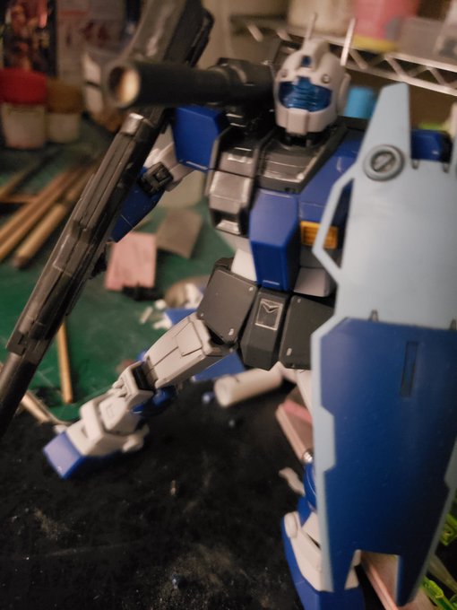 ジムキャノン✨ 久々に表面処理、部分塗装しました🎵⤴️ シルバーのスミがポイントですね✨✨ 膝立ちも綺麗に決まります👍 もう一個ほしいけど、高くて買えない💧 バンダイさん、再版して(‐人‐) #ガンプラ #ガンプラは自由だ #ガンプラの画像貼るとRTされると聞いて