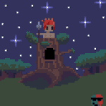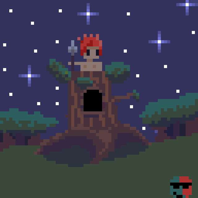 eu fiquei sem fazer pixel art em dois dias ent. resolvi juntar os 3 temas do #pixeltober2022 mitologia, arvore e torre ent. é uma torre arvore com o curupira em cima para proteger a floreta .#pixelart