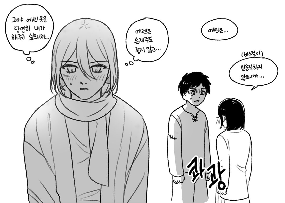 천재지인에게 오두막 에렌미카를 뜯다 물고기 잡다가 홀딱 젖어서 돌아온 에렌을 돌봐주는 미카사…<로 신청했어요!!!!