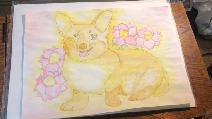ラム「これなんだっちゃ?」...ウエルッシュコーギー描きました笑ラム「このピンクのティッシュは何だ?」花だ!笑 #イラスト好きと繋がりたい #絵描きさんと繋がりたい #水彩画 #ウエルッシュコーギー