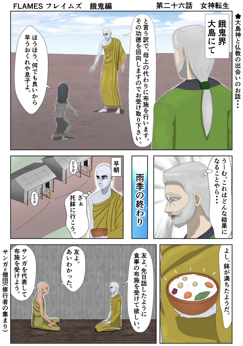 フレイムズ餓鬼編 第二十六話 女神転生 土地神と仏教の出会い話になります。 前回分はスレッドにて。 #漫画が読めるハッシュタグ #漫画