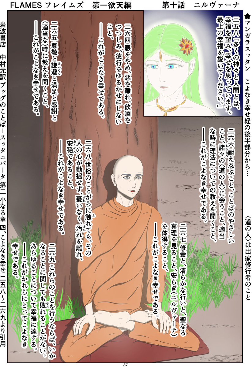 フレイムズ第一欲天編 第九話 こよなき幸せ 今回と次回のお経の訳は、故中村元先生の[ブッダのことば]から引用しております🙇♂️ 前回第八話はスレッドにて。 #漫画が読めるハッシュタグ #マンガ