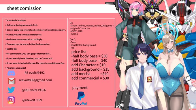 (Retweets are very appreciated !) hello, i am RE : Evolt Here I open a commission free to ask Sample pixiv.net/en/users/93044… #Commission #artcommissions #commissionopen #opencommissions #digitalillustration #digitaldrawing #ArtistOnTwitter #CommissionSheet @cmsn_ART