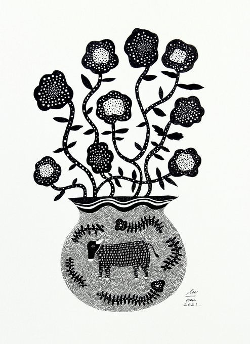開催中の黒木リン展では、身近な景色と生きものが重なるハザマシリーズ以外にも、花のシリーズがあります。上品かつシックな風合いで、観る方に「色」を想起させます。 ▼展示作品は以下のURLからご覧いただけます。 reijinshagallery.com/product-catego… #REIJINSHAGALLERY #日本橋 #黒木リン #ペン画 #花