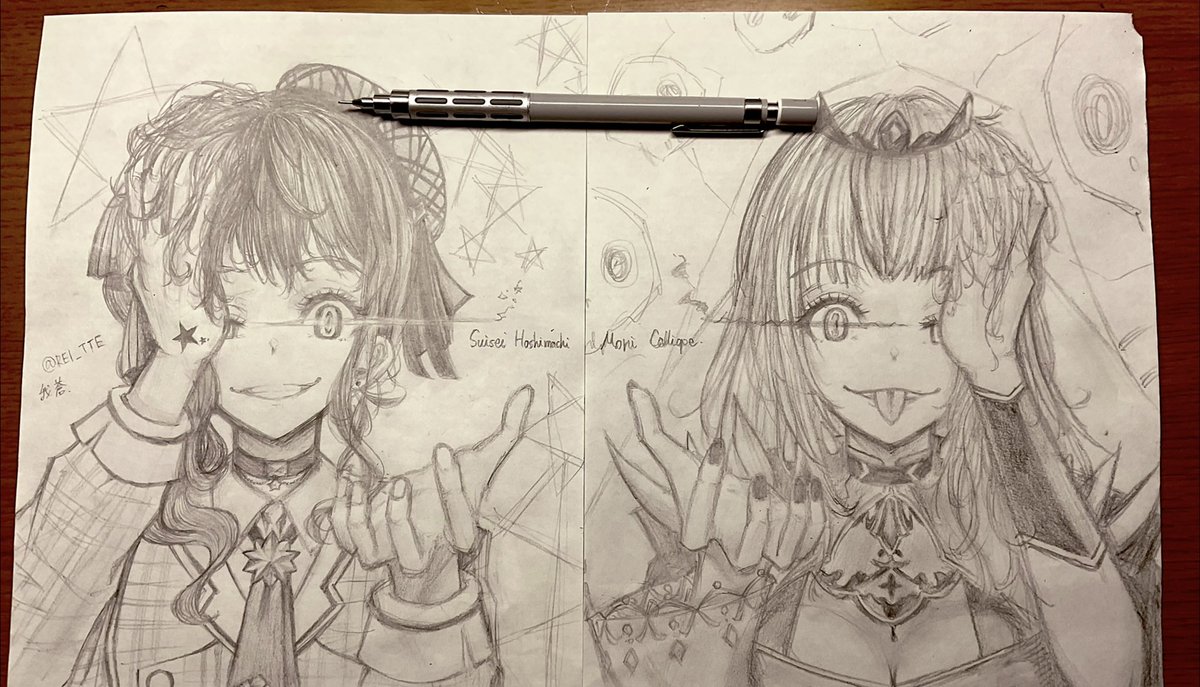 シャーペンだけですいちゃんとカリオペ描いた。 #イラスト #ほしまちぎゃらりー #callillust