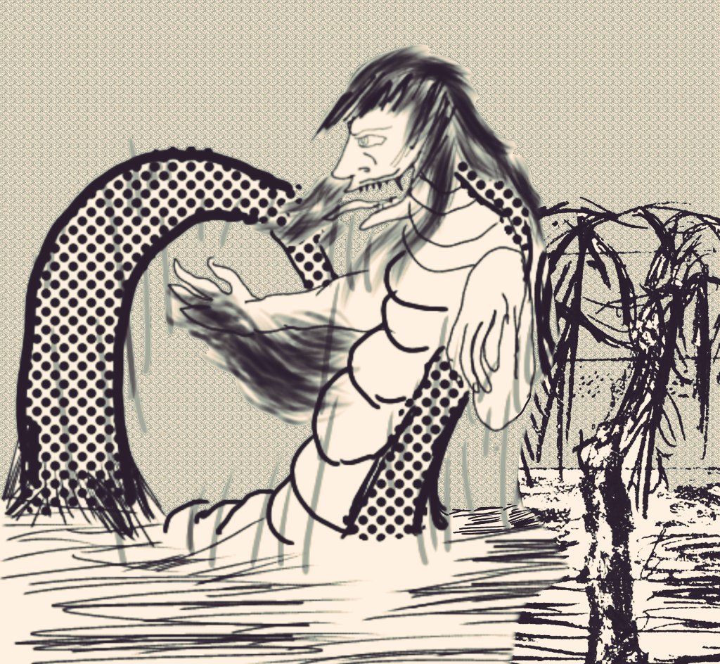 #妖怪 #描いてみた #アイビスペイント #イラスト 濡れ女 海蛇と人間をあわせたような 妖怪 濡れ女に目をつけられたが 最後絶対に逃げられず 長い尻尾で どこまで逃げても 捕まってしまう 牛鬼と一緒に現れる話もある