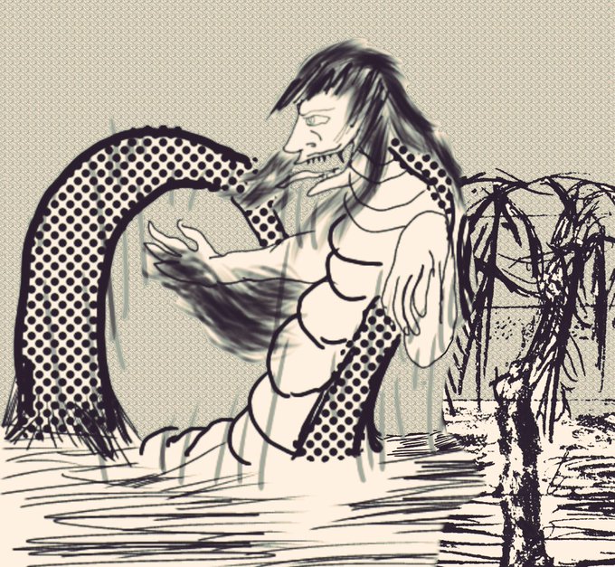 2 12 #妖怪 #描いてみた #アイビスペイント #イラスト 濡れ女 海蛇と人間をあわせたような 妖怪 濡れ女に目をつけられたが 最後絶対に逃げられず 長い尻尾で どこまで逃げても 捕まってしまう 牛鬼と一緒に現れる話もある 23/03/19 21:39