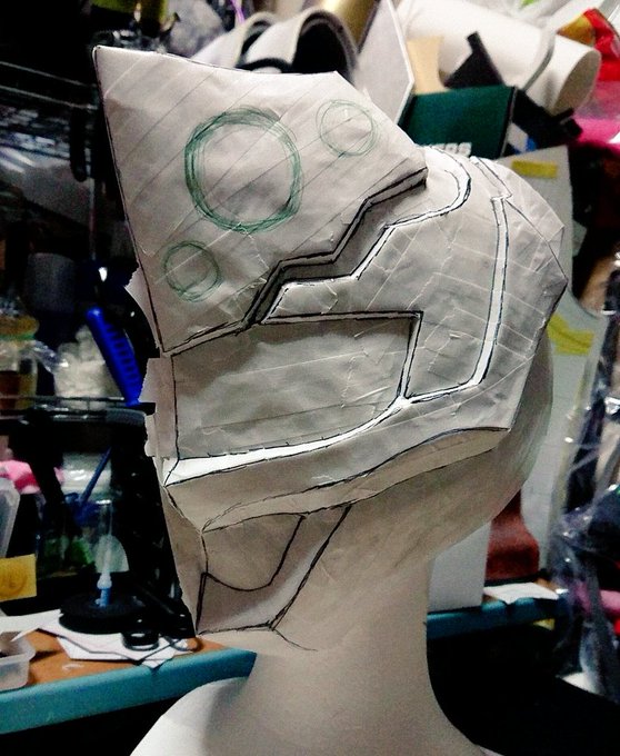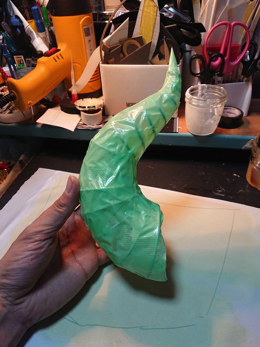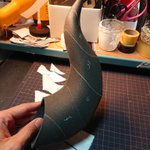 このタイプの角初めて作った… 貼り合わせむずい。 針金と養生テープで立体作って、型紙からのコスプレボードのハード3mmで🙆 #りち造形 #コスプレボード