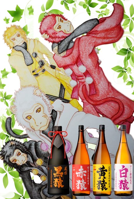 #鹿児島のお酒擬人化ファンアート #小正醸造(@komasajyozo)さまの #赤猿 #黄猿 #白猿 #黒猿 を描かせていただきました四兄弟的なニュアンスにしてみました。お世話になってるお寺さんの近くにあるので看板とかは個人的にかなり馴染みがある酒造さまです #ご酒神さま #日本のお酒擬獣人化ファンアート