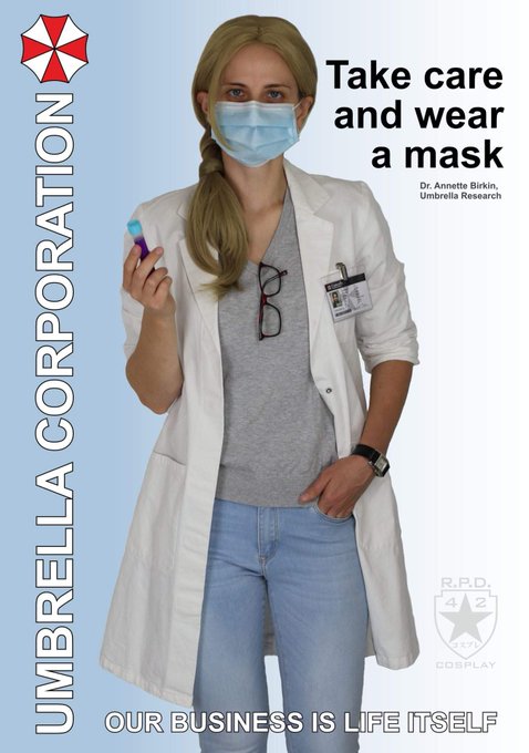 The best protection for your loved ones at these times: 😷 TAKE CARE AND WEAR A MASK - 👩⚕️ Dr. #AnnetteBirkin, #UmbrellaCorporations researcher, who developed with her husband Dr. #WilliamBirkin the G-virus... #REBHFun #Cosplay #Gvirus #Mask #コスプレ #residentevilcosplay