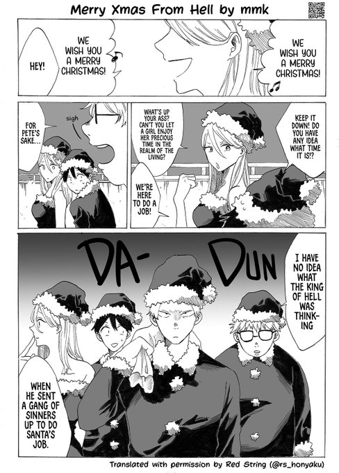 [Merry X'Mas from Hell] Oneshot by MMK Translation and Lettering by Red String Sad news, MMK is no longer on twitter, but you can still support by following on their Pixiv account. pixiv.net/en/users/60716… 1/2 #wholesome #漫画が読めるハッシュタグ #manga #英語学習