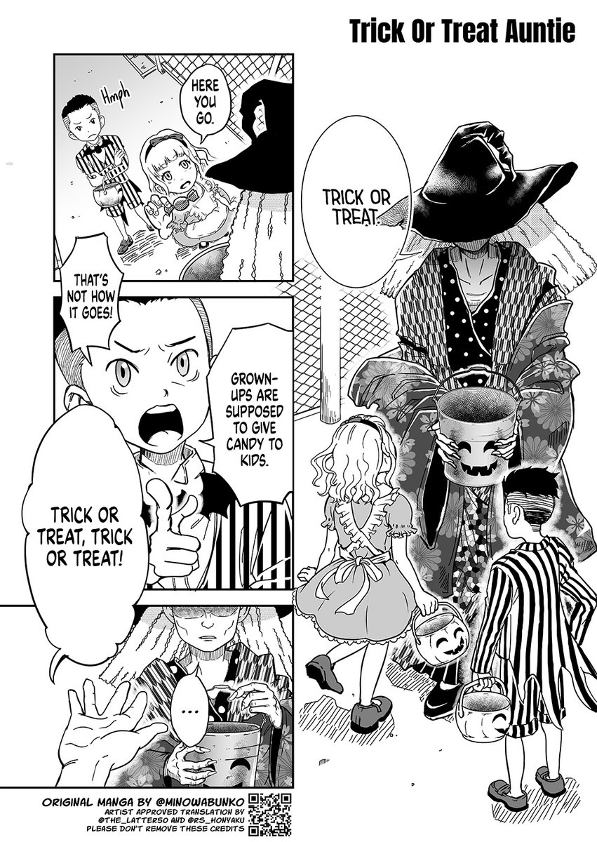[Trick or Treat Auntie] Short Short Horror Chapter 10 from @minowabunko Translation by @the_latter50 and Red String You can expect this to get retweeted in 9 months 🍬 #漫画が読めるハッシュタグ #manga #英語学習 #HorrorCommunity