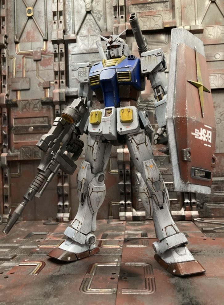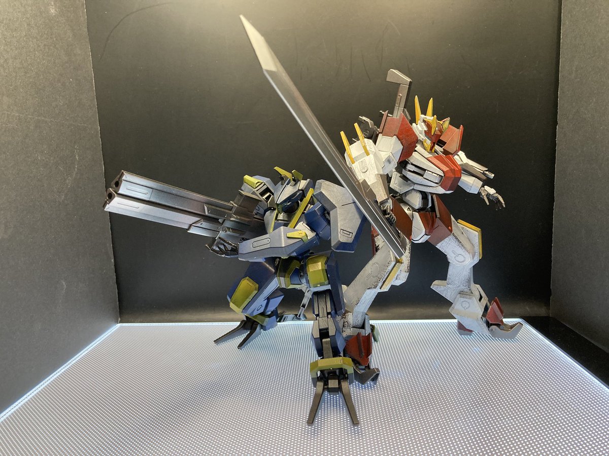 #あなたのキレイな作品とヨゴレタ作品を見せてください 自分の完成品の中では比較的珍しい部類。艶消しコーティングしたリバイブ百式と最新作GMスパルタン(ケープ剥がし+スポンジチッピング)。