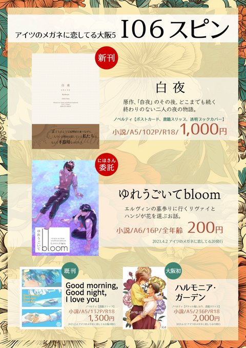 前回メガ恋大阪4の新刊のこちらも少しだけ在庫があるので、メガ恋20のお買い物のついでなどにご興味ありましたら〜。7月大阪メガ恋5にも少し持っていくつもりです☺️ Good morning, Good night, I love you( スピン イチイ ナオ )のご注文はとらのあな通信販売で! ec.toranoana.jp/joshi_r/ec/ite…