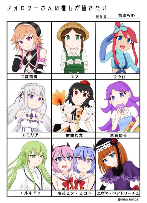 一か月以上かかってしまった… 飛鳥ちゃん→文ちゃんまでがリプ頂いたキャラ、めるめる→エヴァトまでは自分で勝手に入れたキャラです。リプありがとうございました! #フォロワーさんの推しが描きたい