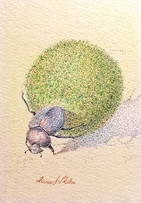 マリモを転がすフンコロガシ描いてみました。 148×100mm #ボールペン画 #点描 #色鉛筆 #ドット絵 #私の作品もっと沢山の人に広がれ祭り