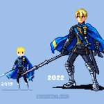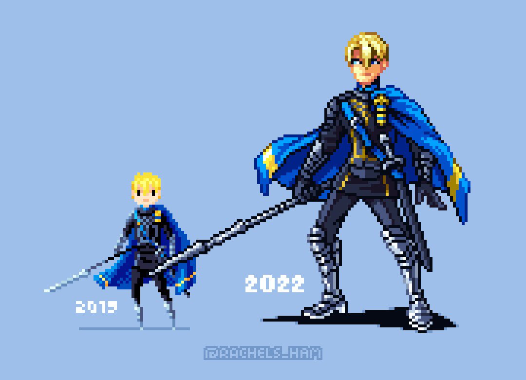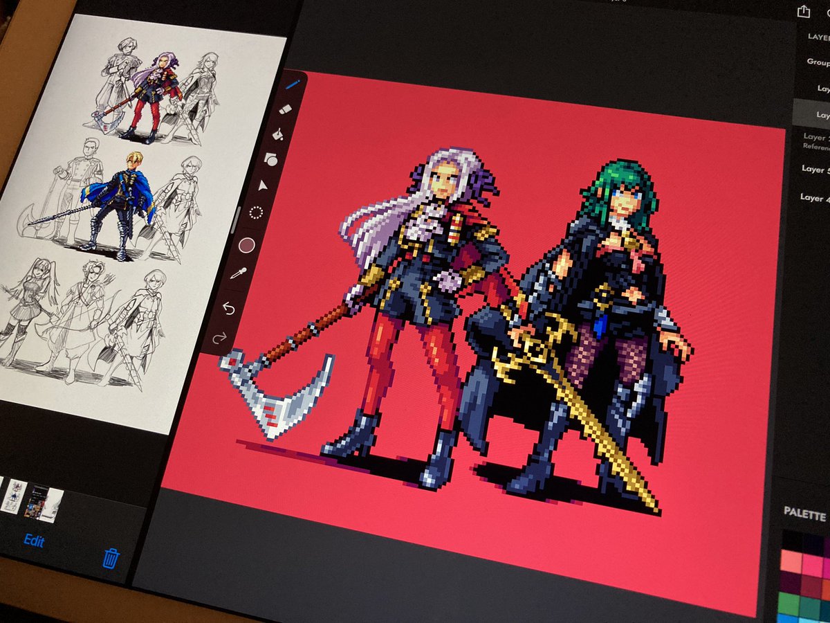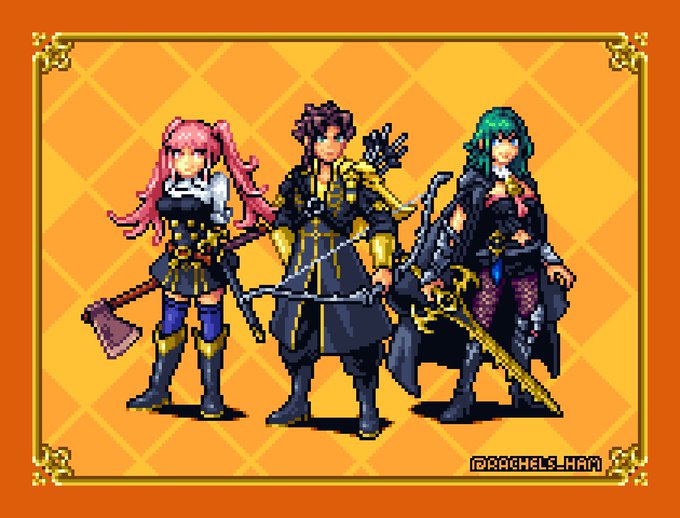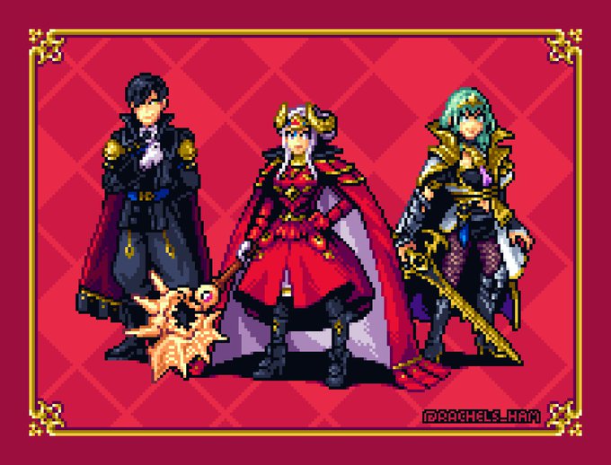Going to try and get this project finished before starting back at work next week. Three separate pieces with three characters on each (see preview sketch on the left). Characters are from Fire Emblem Three Houses. Drawing in Pixaki app. #pixelart #pixelartist #fireemblem