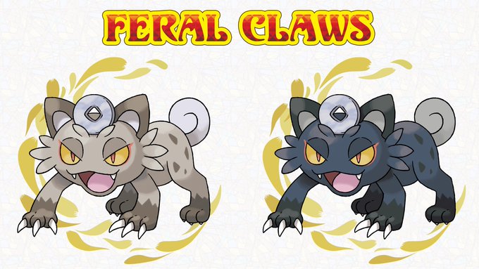 FERAL CLAWS (Fighting) Reminiscent of an ancient Meowth, this beast is known to steal food and other items from researchers' packs, and attacks savagely if confronted. The large stone coin embedded on its forehead is apparently used for sharpening its claws. #PokemonScarletViolet