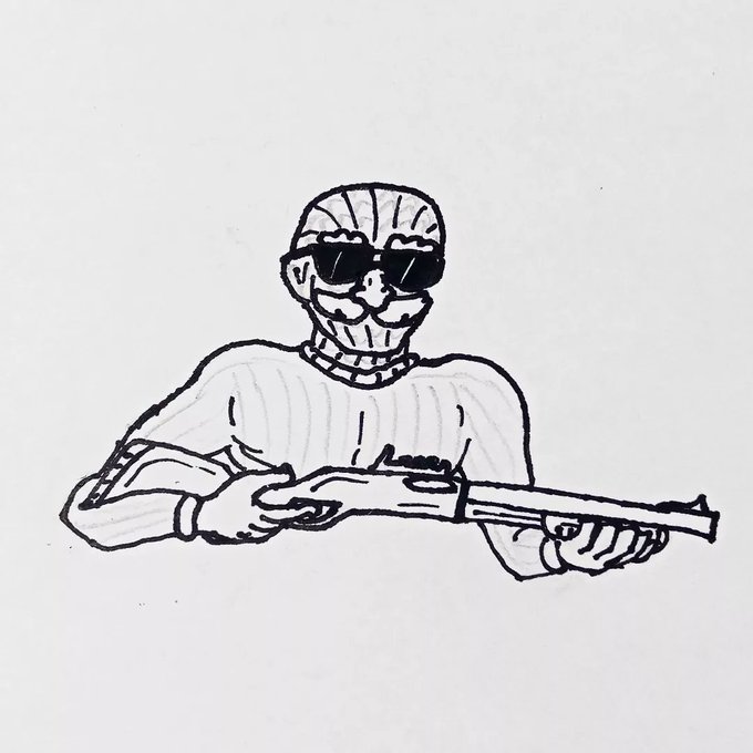 Inktober day 22: Heist A robber with beagle puss sunglasses (he also has a shotgun, but that's less relevant, just look at those silly glasses, so funny) #inktober2022 #heist #beaglepuss #lafamiliademoniac