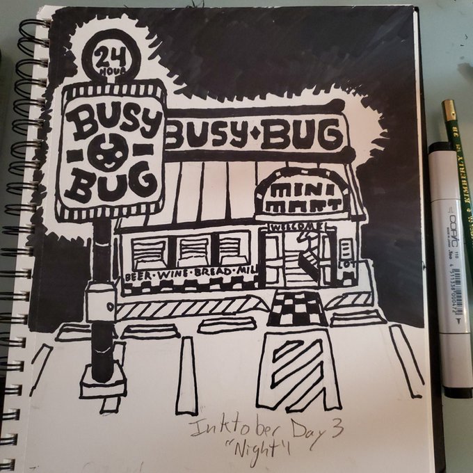 Inktober Day 3 "night". There is something most night about 24hr gas station/convenience marts. Thank you for always being neutral ground home base in the dark. #inktober2022 #witchtober2022