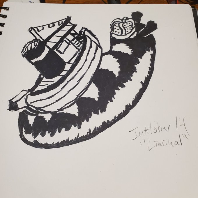 Inktober day 14 "liminal" transitional state. Snails feel like that. They feel off balance but unafraid. So giant emperor snail with a tug boat shell #inktober2022 #witchtober2022 #toottoot