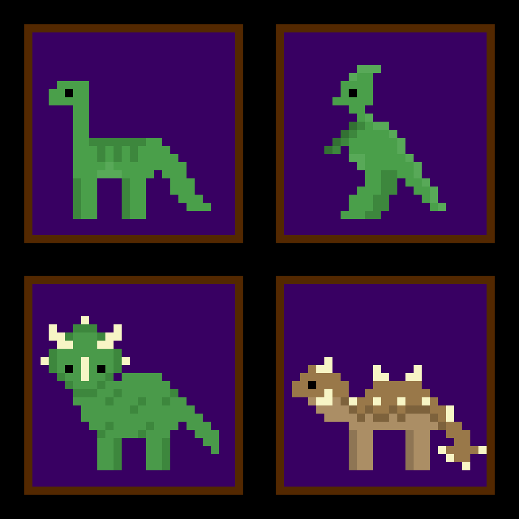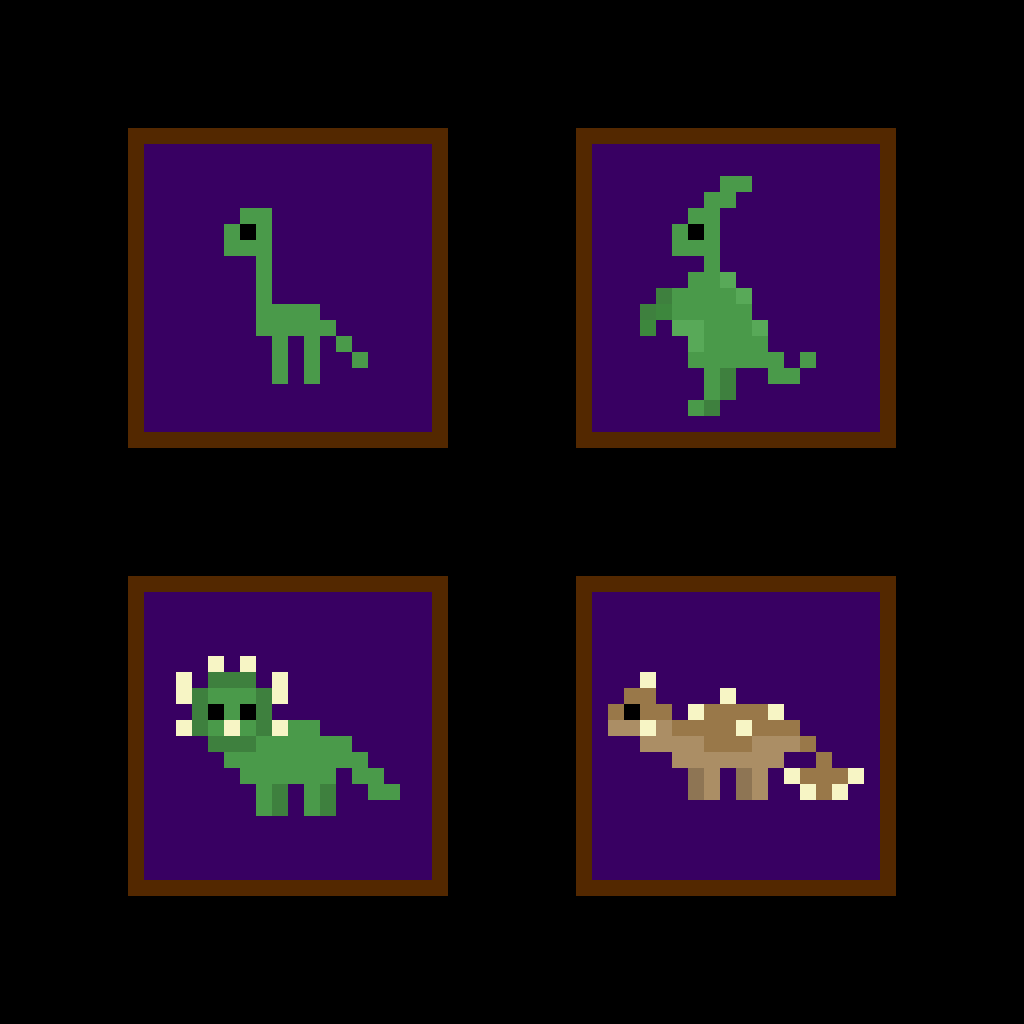 Braquiossauro, Parasaurolophus, Tricerátops e Anquilossauro. Fiz duas versões, uma com mais pixels (max 25x25) e outra com menos (max 16x16). #pixelart #pixel #pixelartist #pixel_dailies #dinosaurs #ドット絵 @Pixel_Dailies