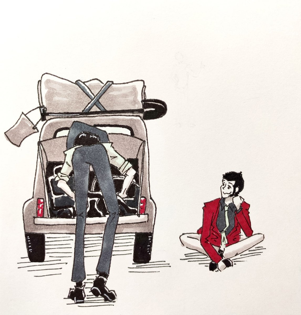Day 7: Trip This is my and friend's headcanon, that mostly Jigen looks after gung's Fiat. We even have a fun pairing Jigen/Fiat =D And just look at this sexxy bony ass... #inktober #inktober2022 #lupinthethird