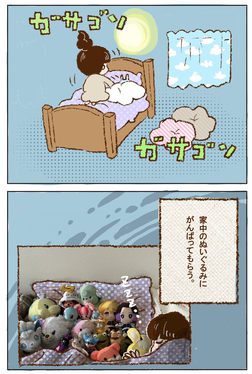 発売中の綿まみれコミックエッセイの試し読みその④です。 今日もこんな感じで裁断したら生地がギリギリすぎて疲れました。余裕を持って生きていきたい今日この頃です… #漫画が読めるハッシュタグ #エブリデイ綿まみれ #ぬいぐるみ作家