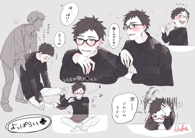 酔っ払い♣️くん そこらの後輩にぽやぽやの顔で接するし、笑い上戸になってわはわは笑うし、挙句の果てには自作の歌を歌い出すし、普通に飲みすぎて潰れる。潰れた後はずりずり引き摺られて隅っこですやすや寝るまでがテンプレだとかわいい。