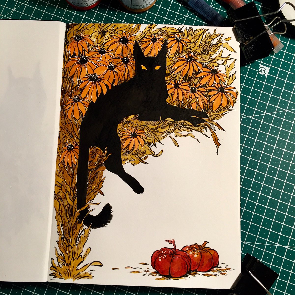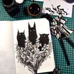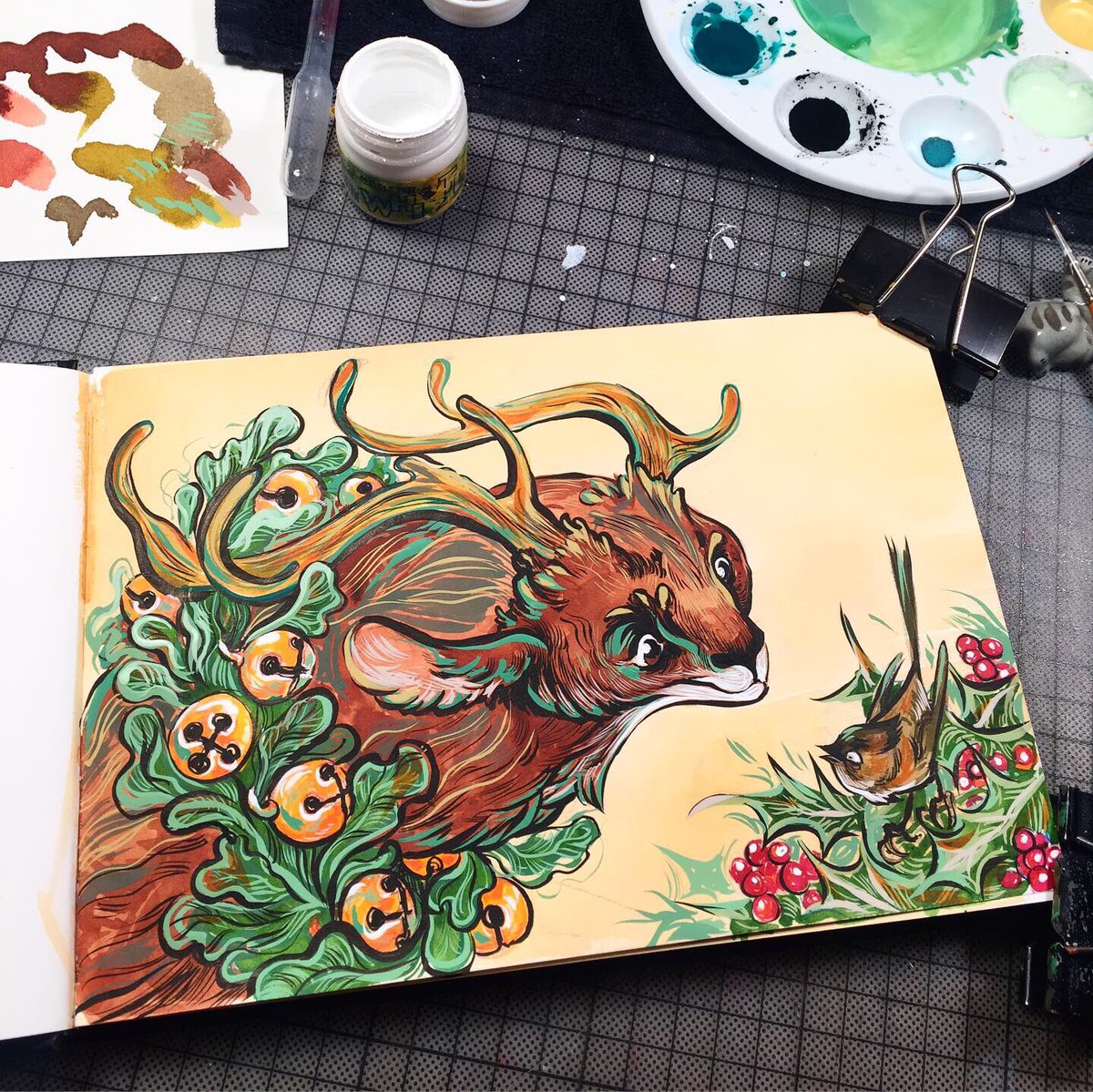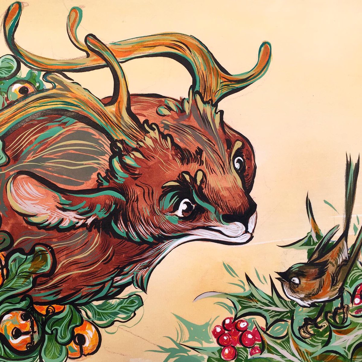 .... I had no idea how this would turn out... yay #bells #yule #winter #cozy #fauns #gouache #ink #colorful #sketchbook #brushwork #lineart #hollyleaf #illustration #traditionalart
