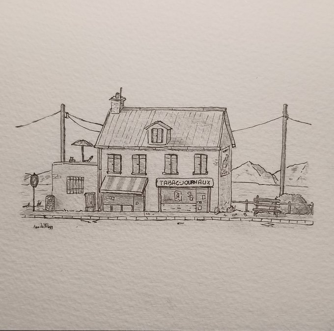 Pour le patron du Beaulieu : petit portrait de l'endroit où je réalise certains de mes #GribouillonsDeBar depuis quelque temps 🙂 Un très grand dessin (pour moi) : 10x7 cm 😀 #Gribouillons #GribouillonsDeRandallFlagg #sketch #dessin #doodle #drawing #illustration #comics