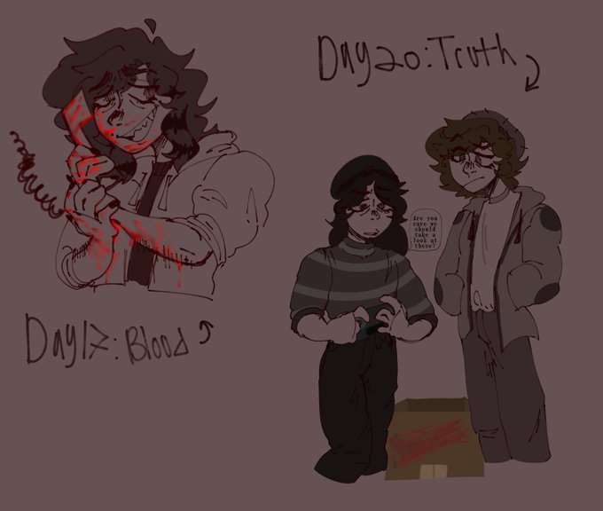 Hello twt it's been over a year since I posted/j but I did some of the days dw I'm just too lazy to finish them digitally 😭 I'll probably post a thread of the sketches I did maybe idk //cw for blood #generationloss #generationlossfanart #ranbooart #aimseyfanart #tubbofanart