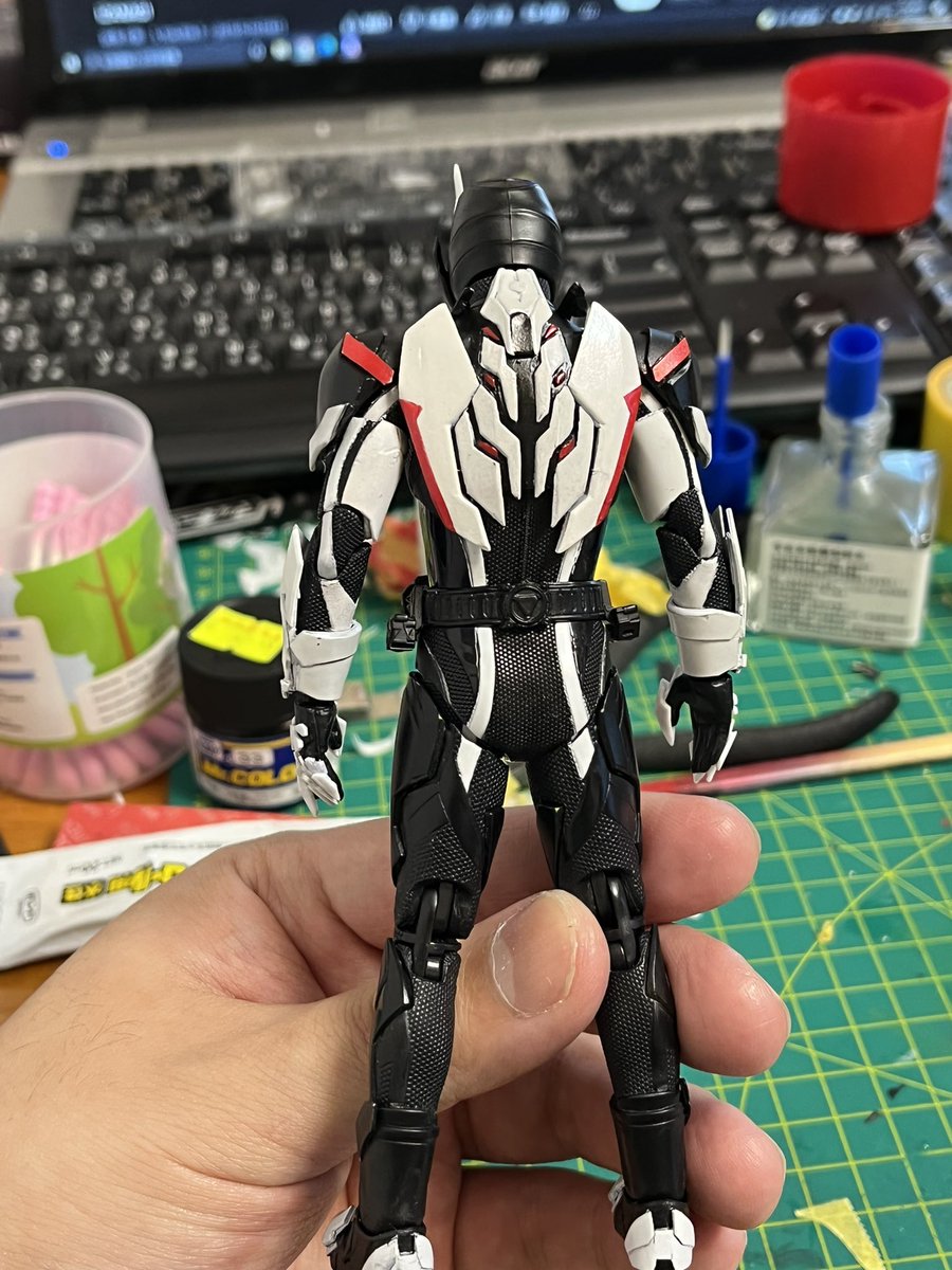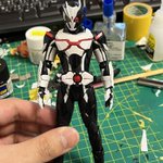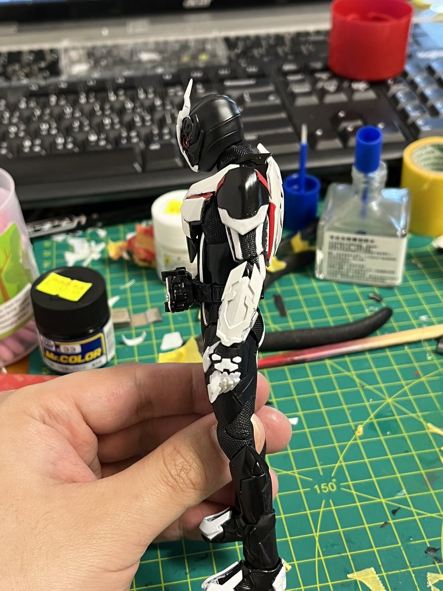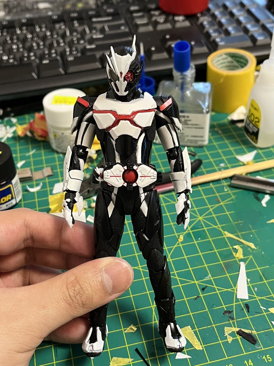 マスク幅増し、胴体独特、肩アーマ接続、膝関節の修改が完了です 残るのは明日でやる スーツのカッコ良さを再現するため毎回もこうやって修改して流石に僕だって疲れますわ しっかりしてくださいよバンダイさん🤢 #ニチアサフィギュア改造部