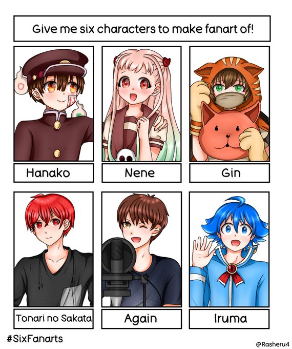 I made the #SixFanartsChallenge Thank you @KisakiMilanes for give me the characters :D #SixFanarts #魔入りました入間くん #あげいん #地縛少年花子くん #キミガシネ #となりの坂田 #あほの坂田 #うたいて #irumakun #Hanakokun #yttd #jshk #kgs #utaite