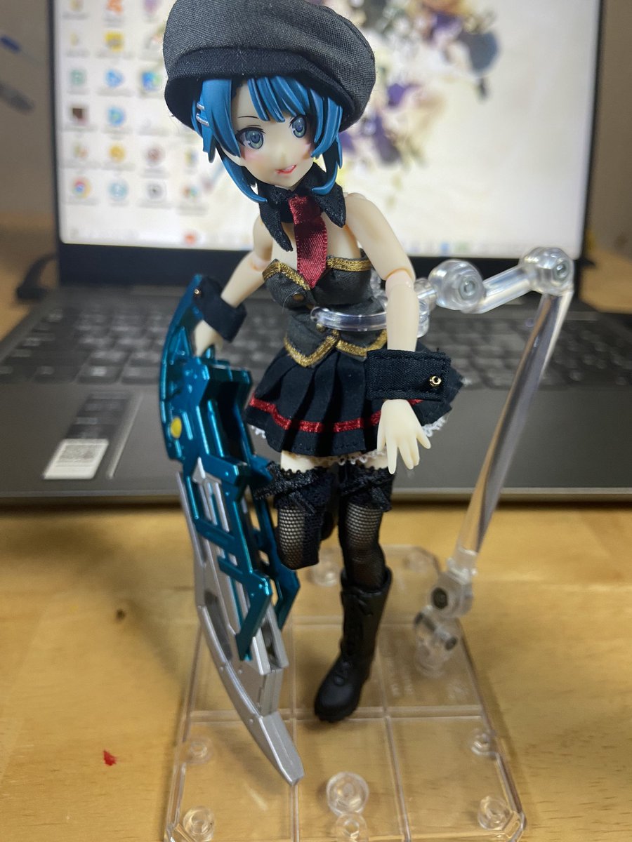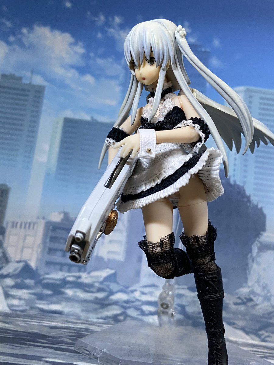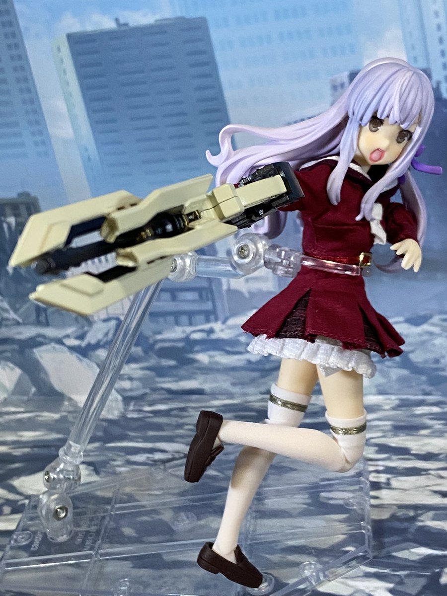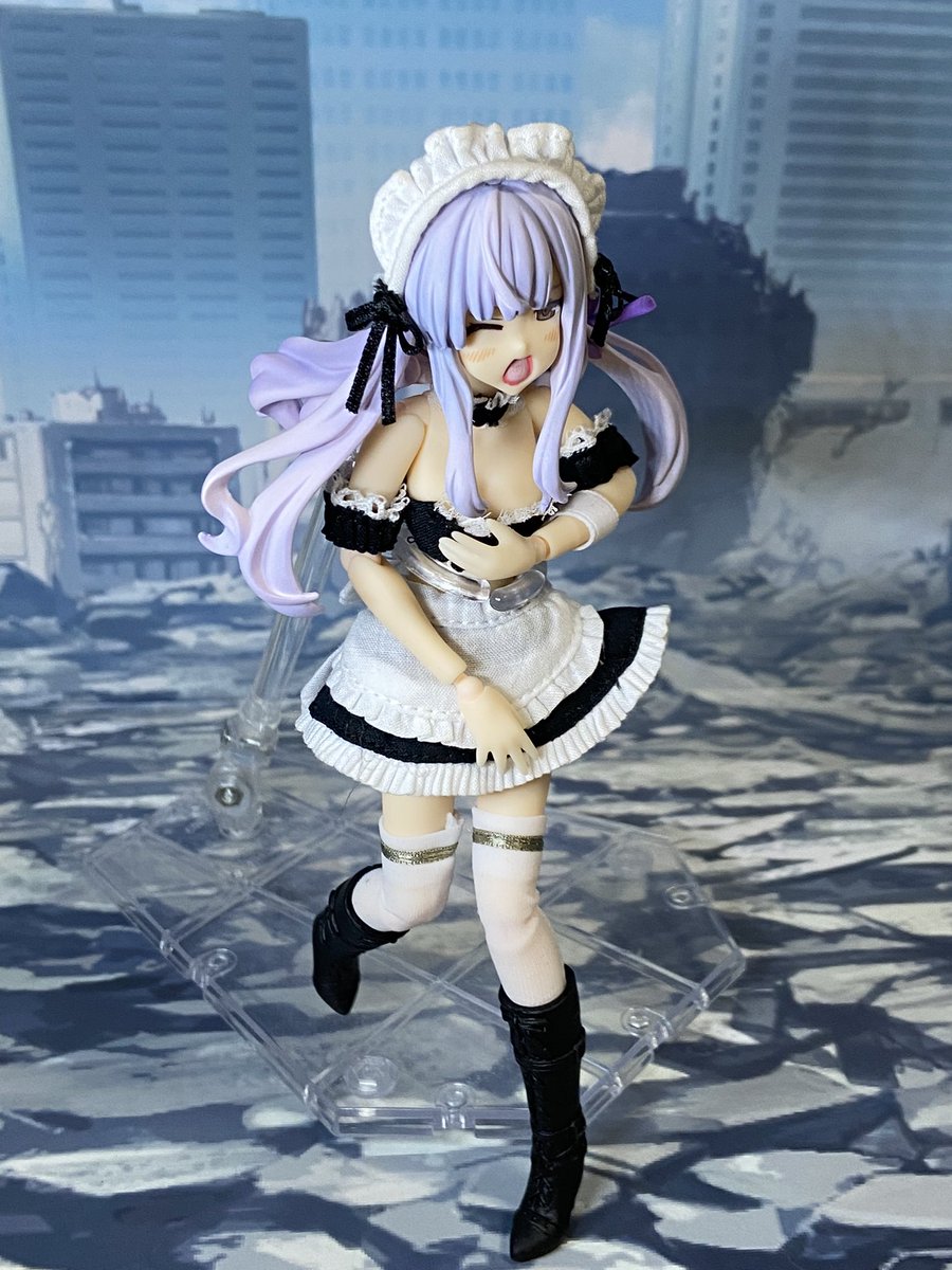 叶星様色々ポーズつけたりしてた。 やはりかわいい! クラウソラスは片手持ちできるの割と凄いし変形も格好いいから素晴らしい出来栄え!(2枚目が片手持ち、3枚目は剣先を支えてます) そして予想通りに似合うメイド服! #アサルトリリィドール部
