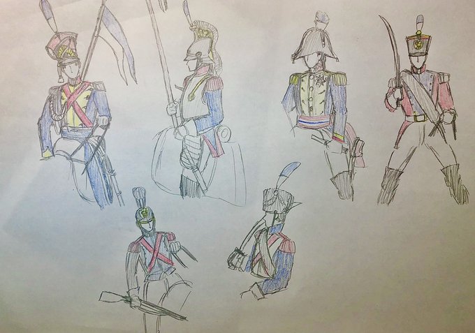 4 10 (rkgk)妄想でナポレオン戦争頃のブルゴーニュ軍(騎兵)を描いてみた 上段:槍騎兵、胸甲騎兵、将軍、軽騎兵 下段:竜騎兵、猟騎兵 参考は同時代のフランスとオランダ、ベルギー 22/05/08 19:14
